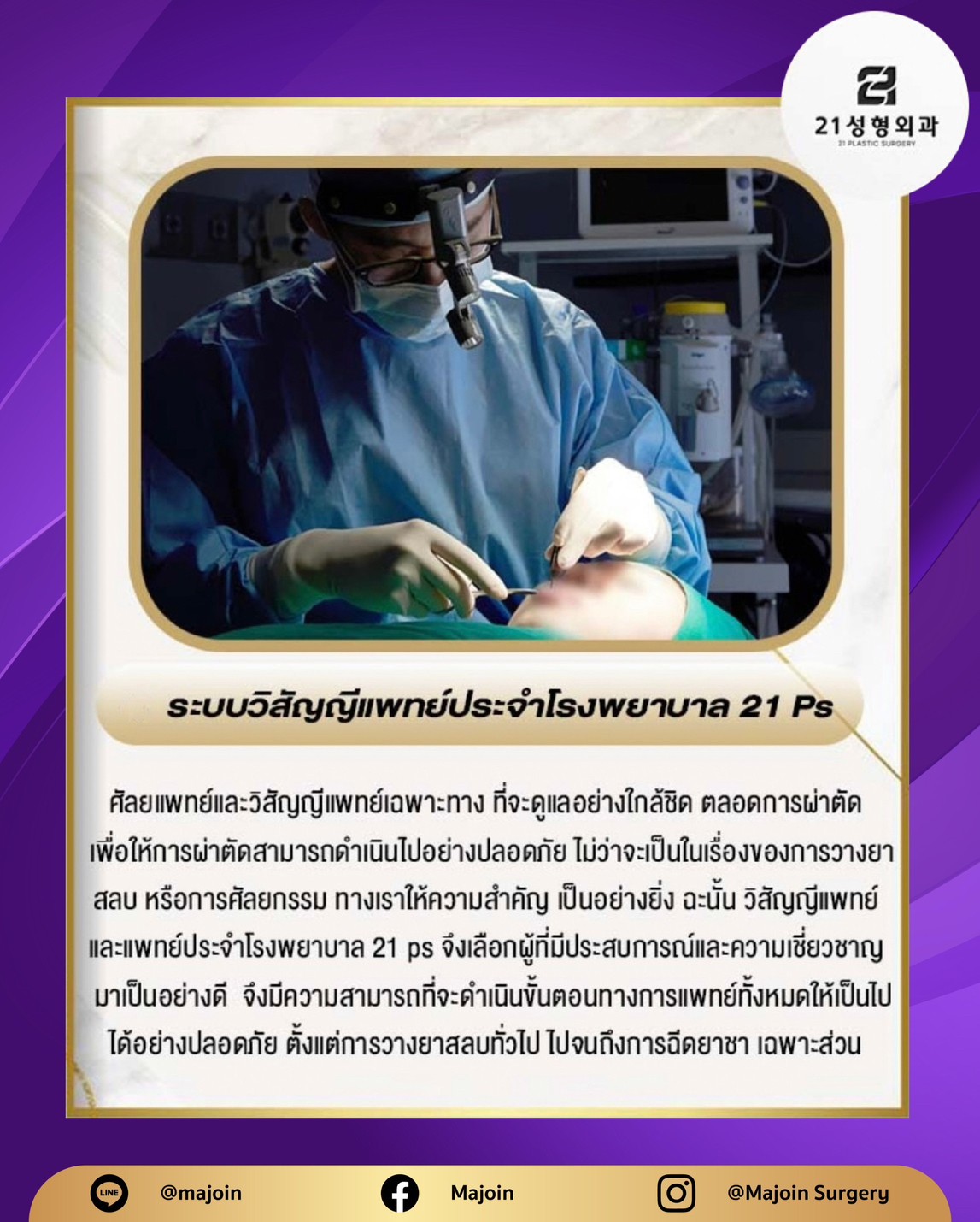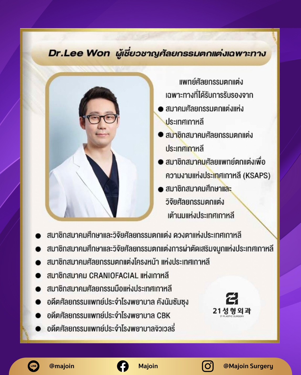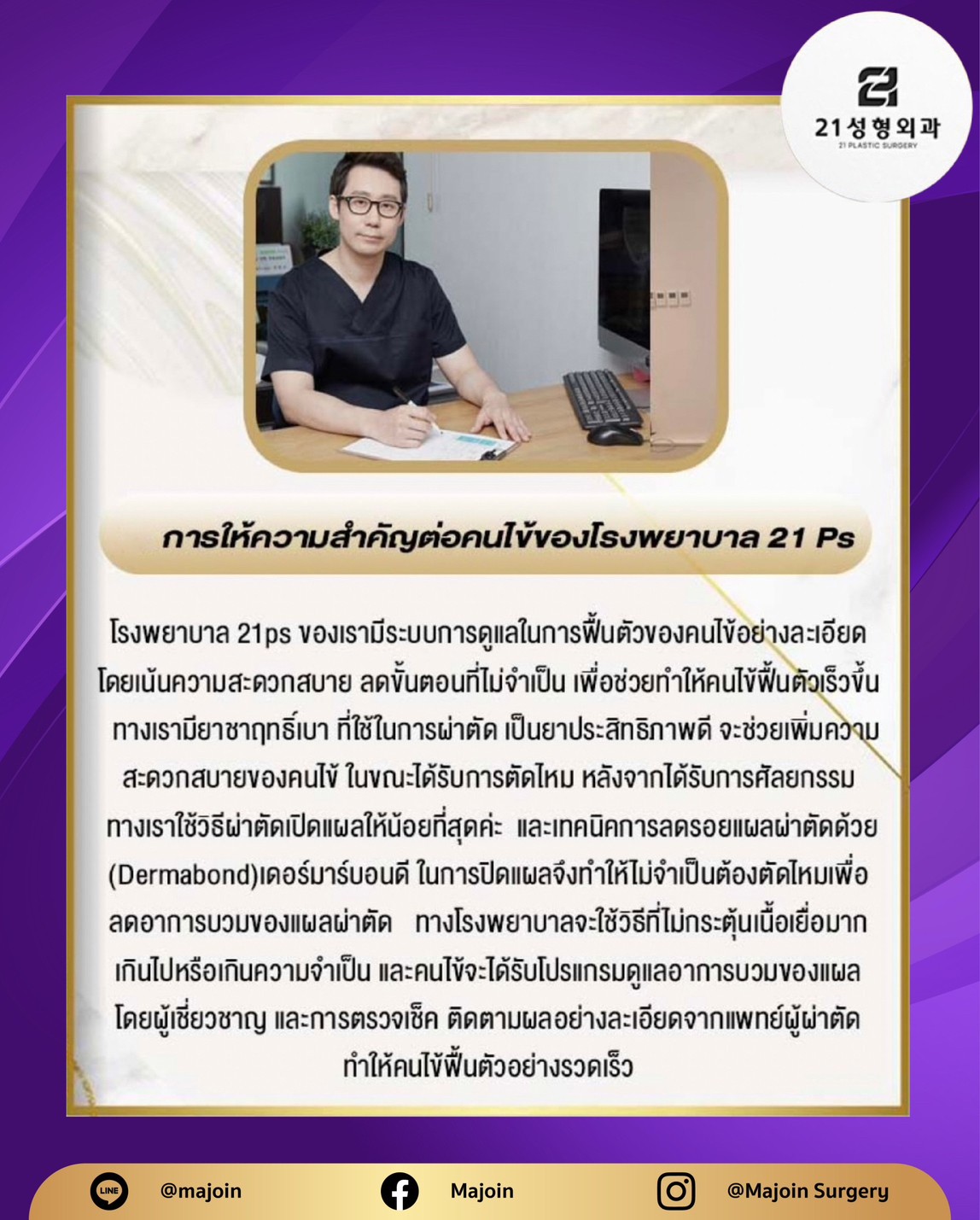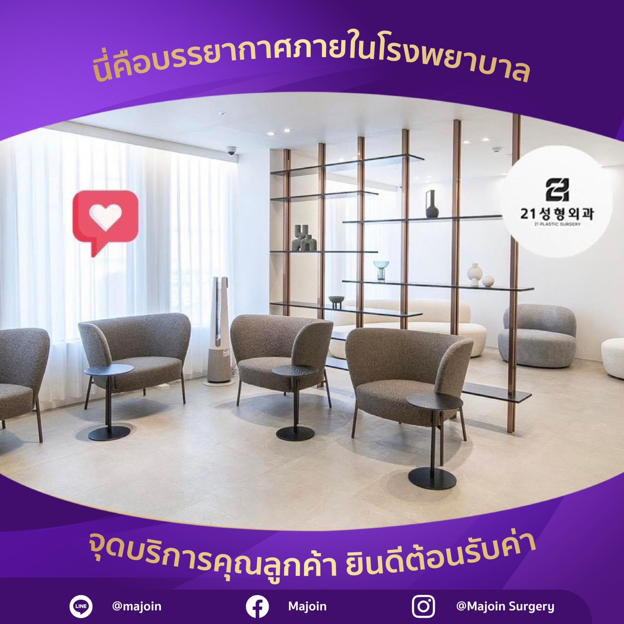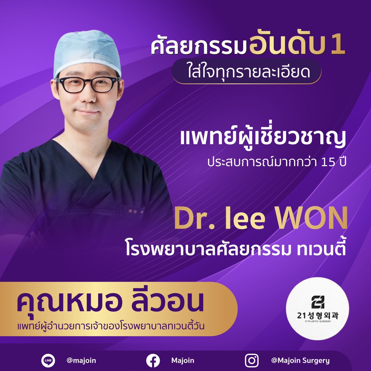 โรงพยาบาลศัลยกรรมทเวนตี้วัน คังนัม โซล บริการศัลยกรรมครบวงจร พร้อมดูแลทั้งก่อนและหลังศัลยกรรม ที่มีประสบการณ์และมีความเข้าใจในศาสตร์ด้านการทำศัลยกรรม แพทย์ผู้เชี่ยวชาญโครงหน้า Facility&Buildingบรรยากาศในโรงพยาบาล ติดต่อเรา